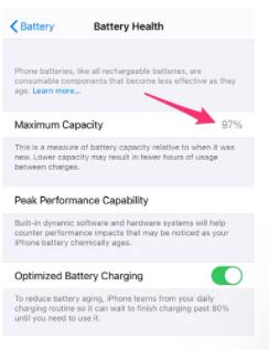 4、Then in the battery health page you can see the display of the maximum battery capacity percentage, below your battery is less than 80%, then you can consider the Apple repair point to replace the battery!