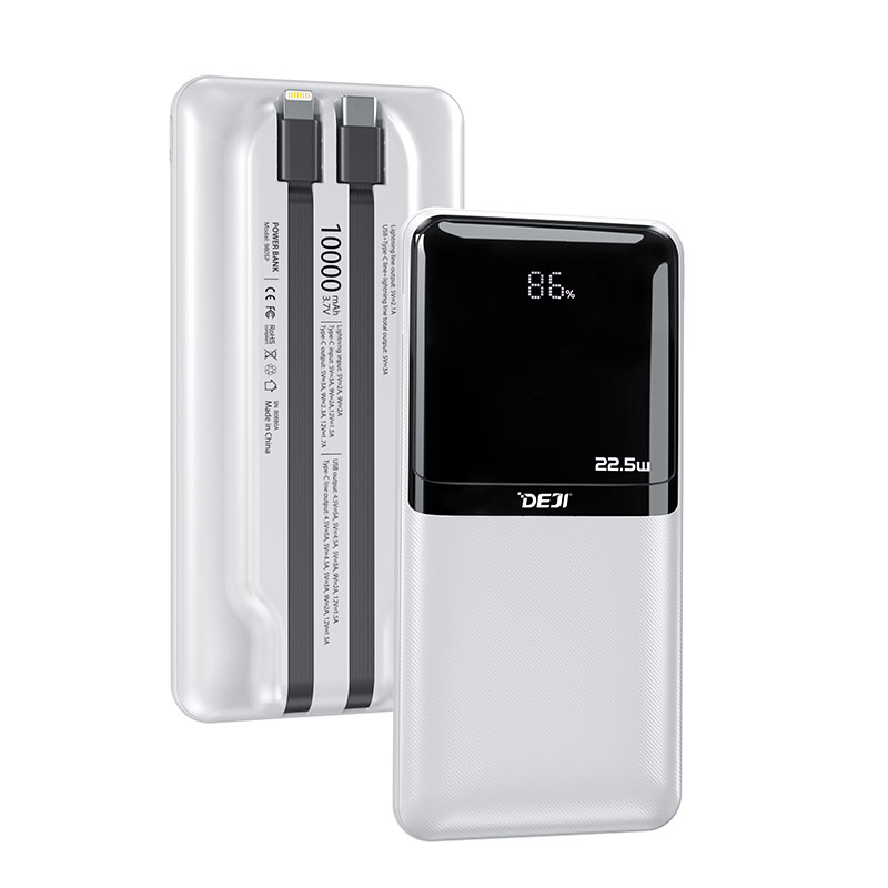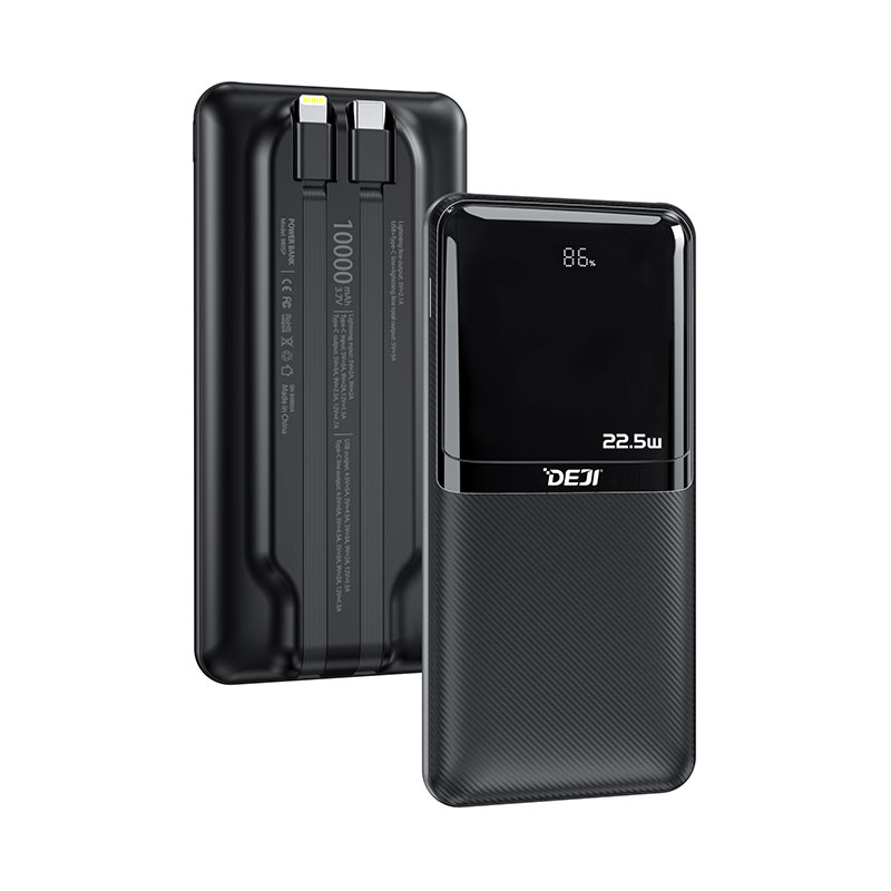 DEJI-BP980SP portable power bank is light and compact. It uses a large screen to display the charging and discharging status, and the frosted shell design is full of fashion sense. Type-C and Lightning data cables are built-in on the back of the fuselage. Only one DEJI-BP980SP can avoid the trouble of forgetting to bring data cables and charging when going out.